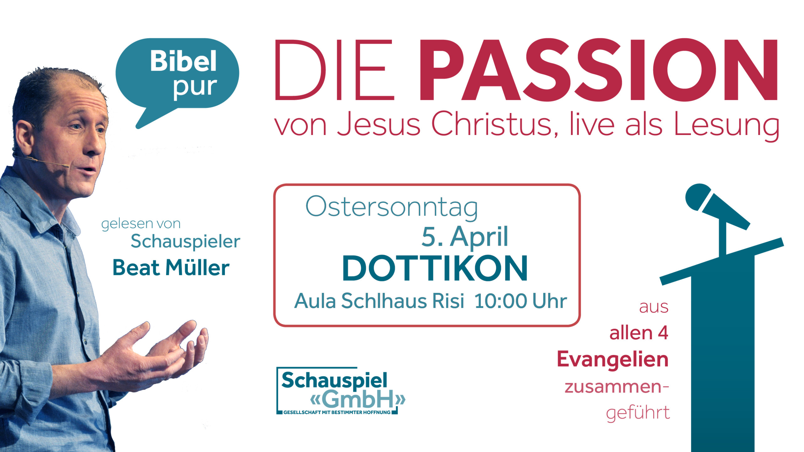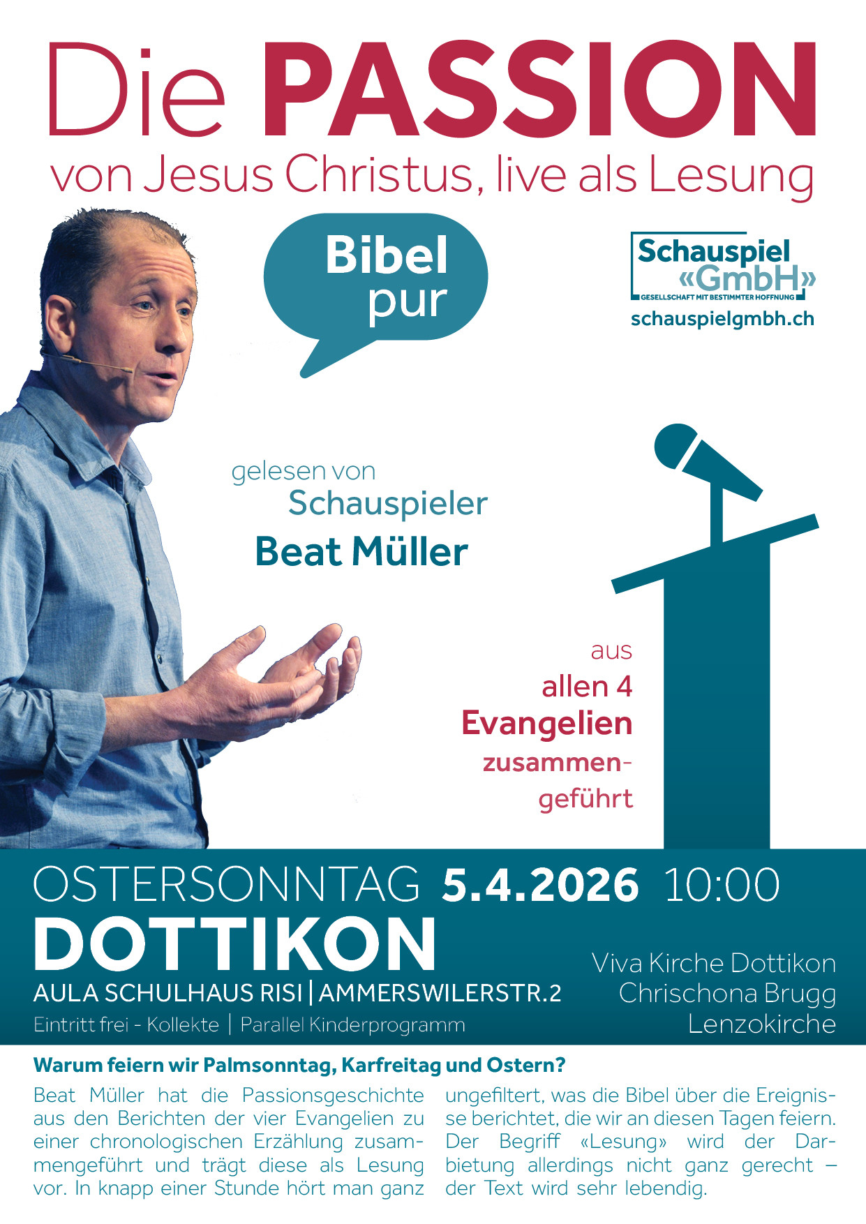 DOTTIKON – Am Ostersonntag erwartet die Region ein besonderes kulturelles und kirchliches Highlight. Die Viva Kirche Dottikon, die Chrischona Brugg und die Lenzokirche spannen zusammen, um die Passionsgeschichte in einer ungewöhnlichen Form auf die Bühne zu bringen. Der Schauspieler Beat Müller präsentiert «Die Passion» als lebendige Lesung in der Aula Risi.